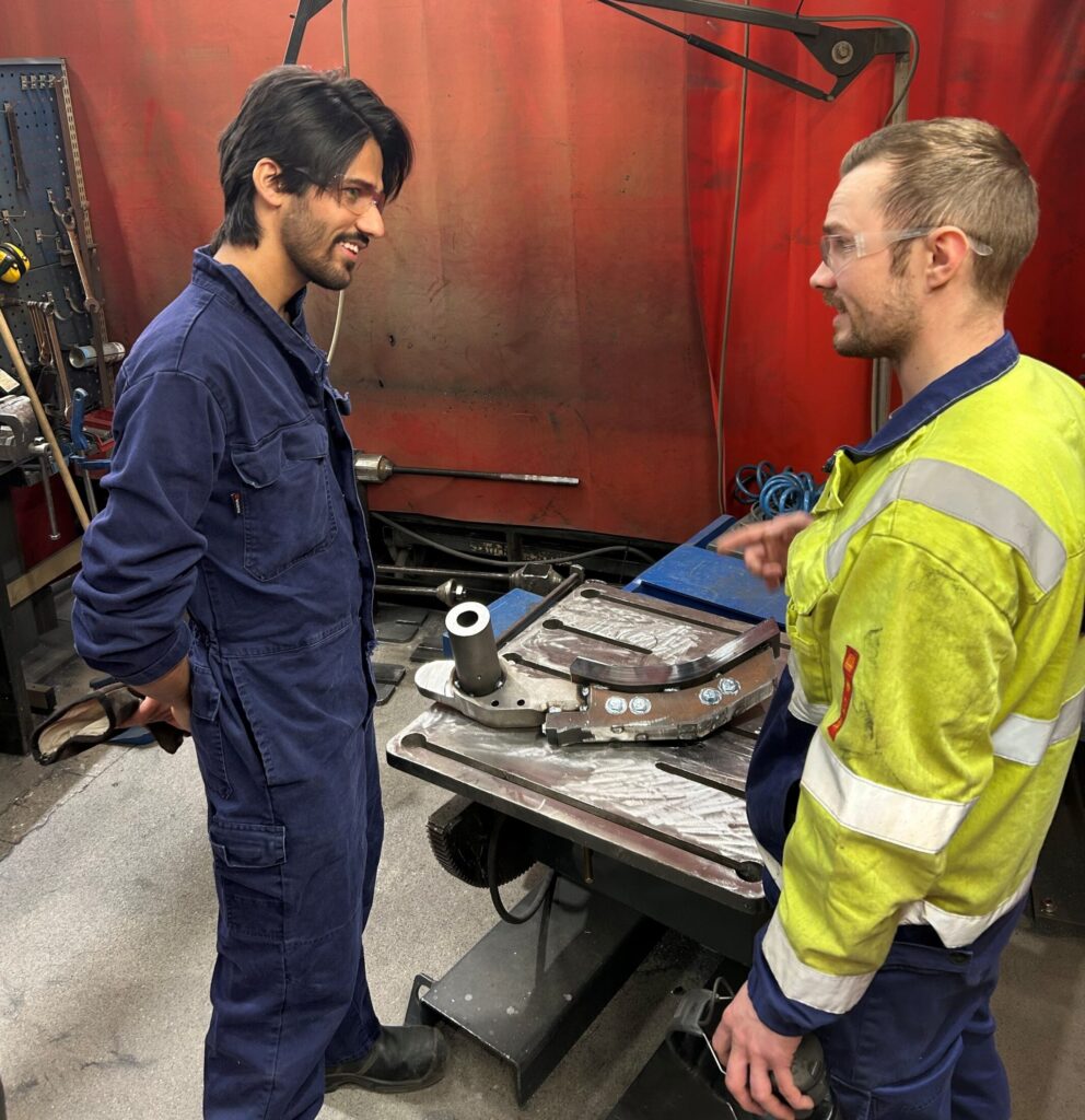 Kuvassa harjoittelija Shahid Nazir (vas.) ja työhönopastaja Toni Räsänen hitsattavien osien äärellä.